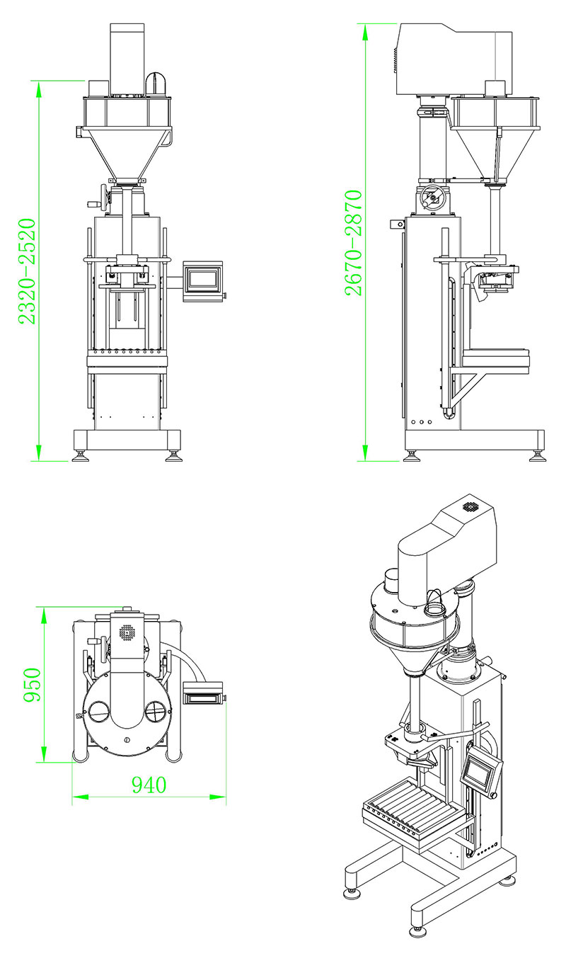 該機主要針對容易揚塵的超細粉末及高精度的包裝要求而開發(fā)設(shè)計,根據(jù)裝在容器下面的重量傳感器給出的信號完成雙速充填、計量及升降等工作,適用于包裝添加劑、碳粉、滅火器干粉、其它超細粉末、及有高精度包裝要求的粉末等。