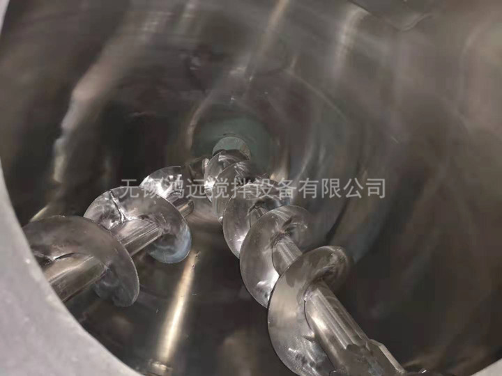 單錐形雙螺旋混合機(jī)的攪拌部件為兩條不對稱懸臂(轉(zhuǎn)臂);不同長度,它們環(huán)繞錐形容器的中心軸軸線轉(zhuǎn)動(dòng)(公轉(zhuǎn))的同時(shí),還借助轉(zhuǎn)臂下方兩根螺旋做自轉(zhuǎn)運(yùn)動(dòng);該設(shè)備通過懸臂與螺旋的公、自轉(zhuǎn)使物料反復(fù)提升實(shí)現(xiàn)混合目的。