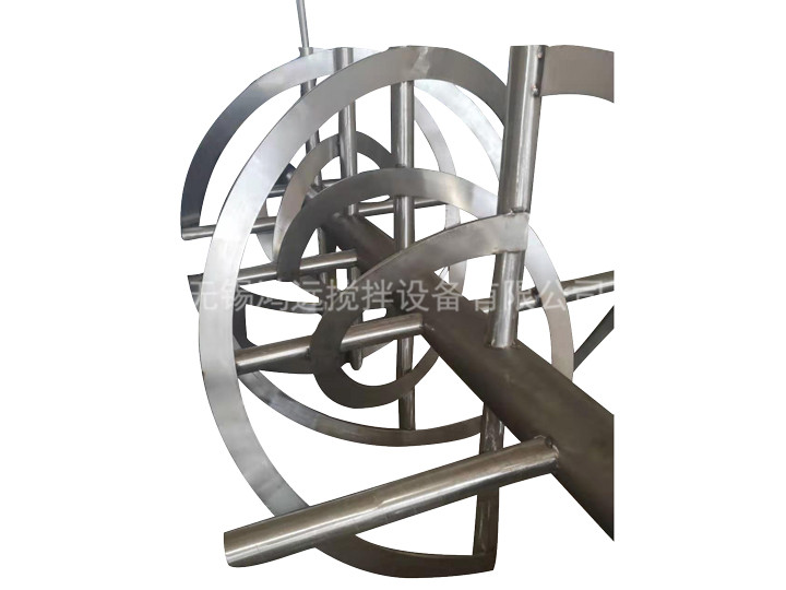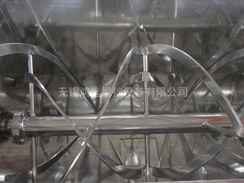 外螺旋帶盤繞形式配合旋轉(zhuǎn)方向把物料從兩端向中間推動(dòng),而內(nèi)螺旋帶把物料從中間向兩端推動(dòng),形成對流混合,物料在相對短的時(shí)間混合均勻,設(shè)備應(yīng)用于干粉、顆粒、液體與低粘度的漿料。